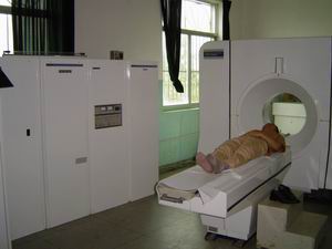 龙亢农场医院千方百计筹措资金更新医疗设备,提高 医疗技术水平,扩大医疗半径,取得了良好的经济效 益和社会效益。图为医院医生在为病员做CT检查。