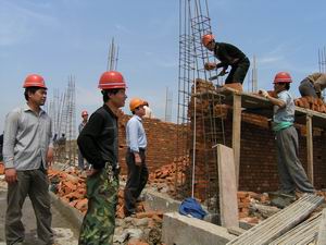 5月16日上午,几名职工代表正在潘村湖农场移民 迁建工程“蟠龙花园”小区建设工地参加由场工会 组织的移民迁建工程职工民主监督活动。(上图)